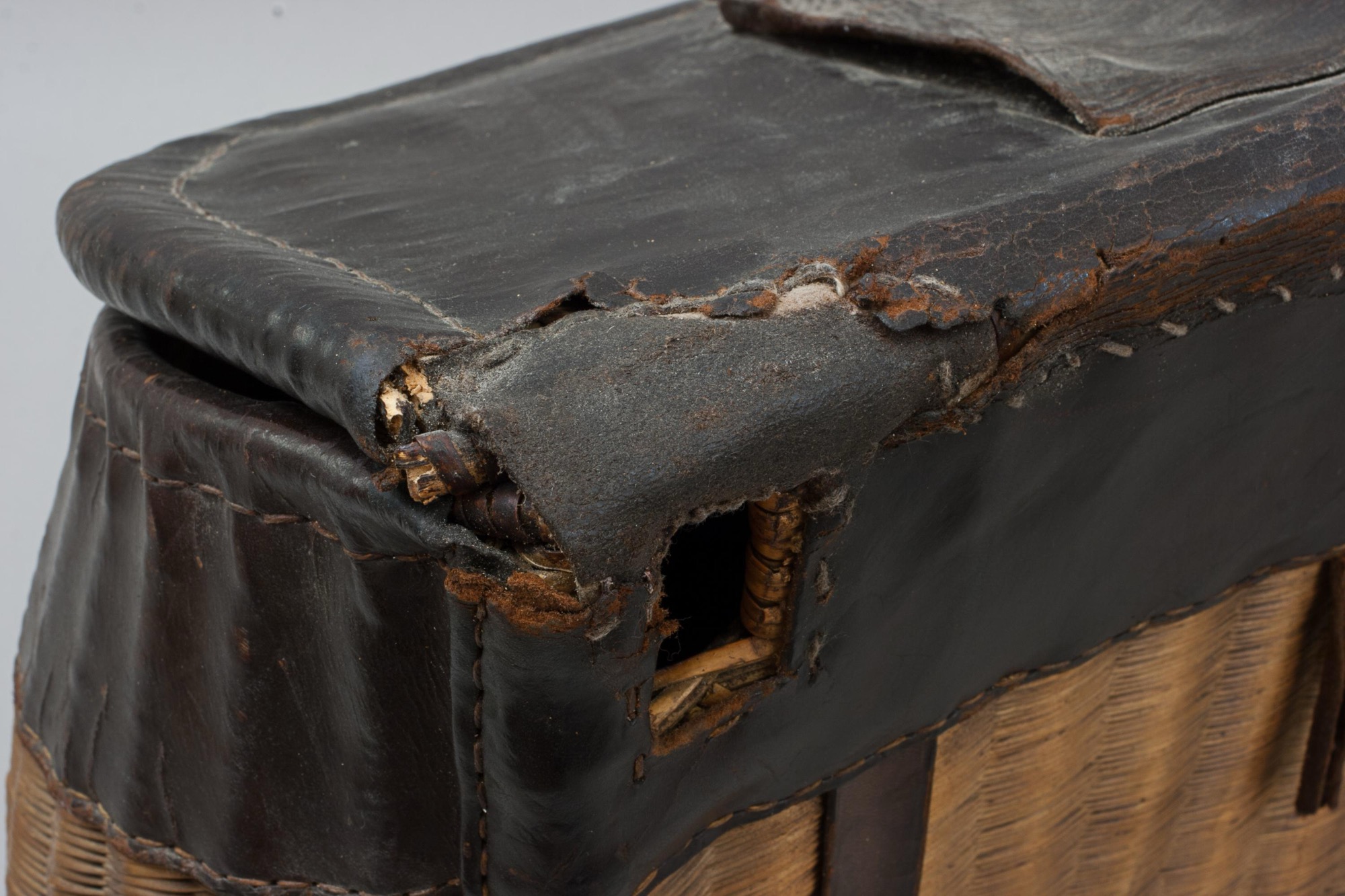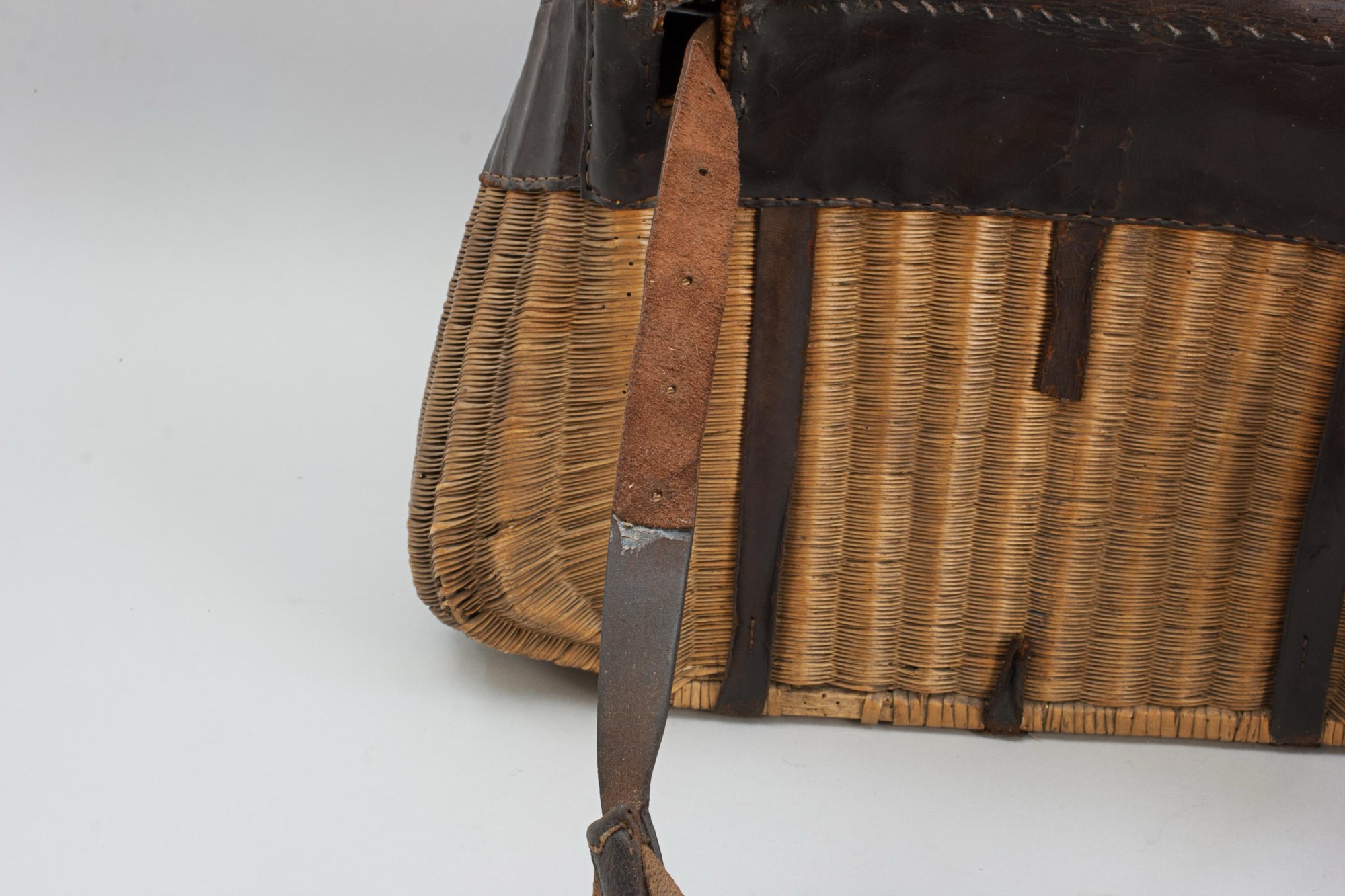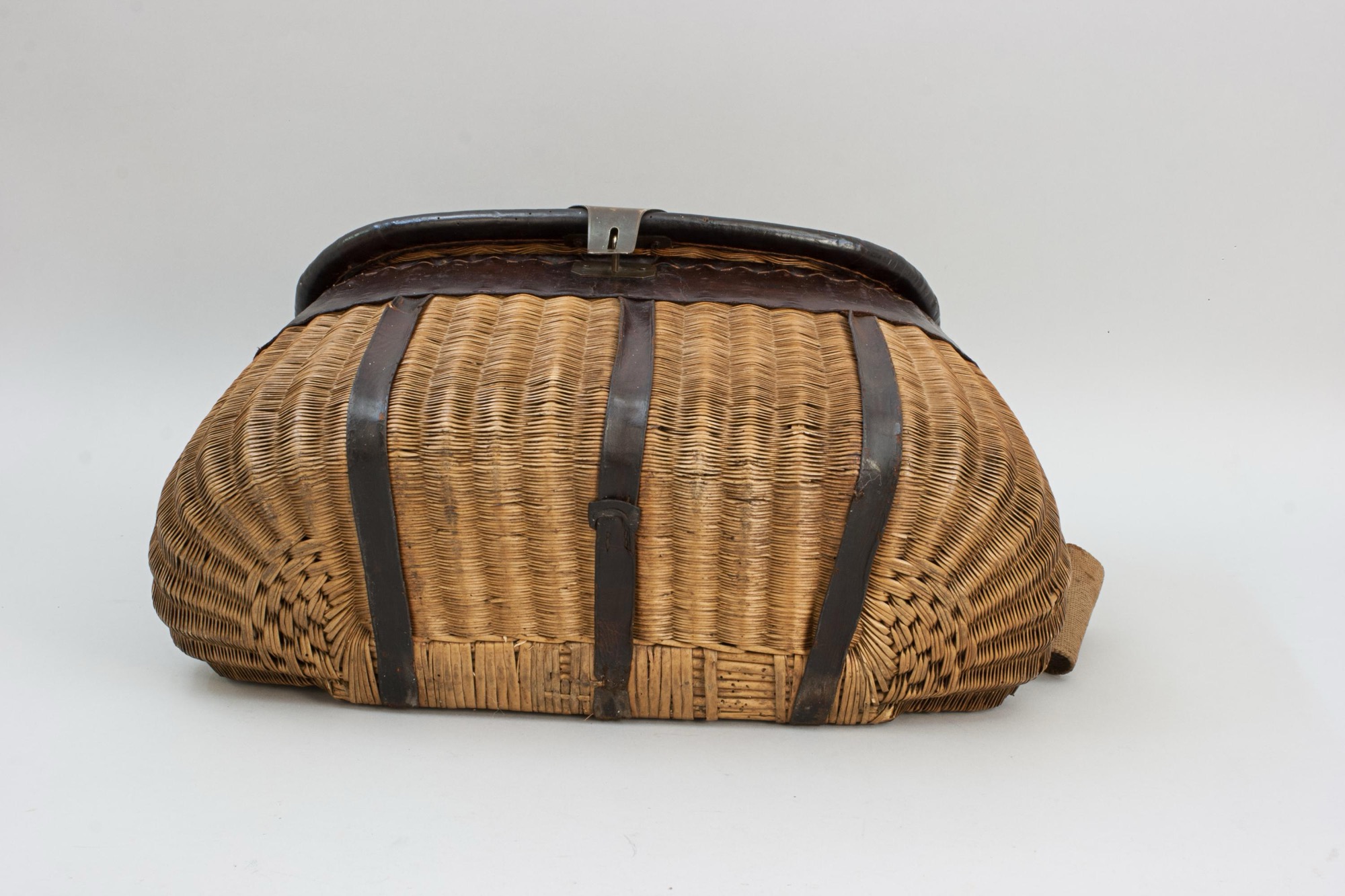A very good example of an early wicker fishing creel. The finely woven wicker creel is made in the traditional design and is with leather trim, leather and canvas shoulder strap and a brass central catch.
