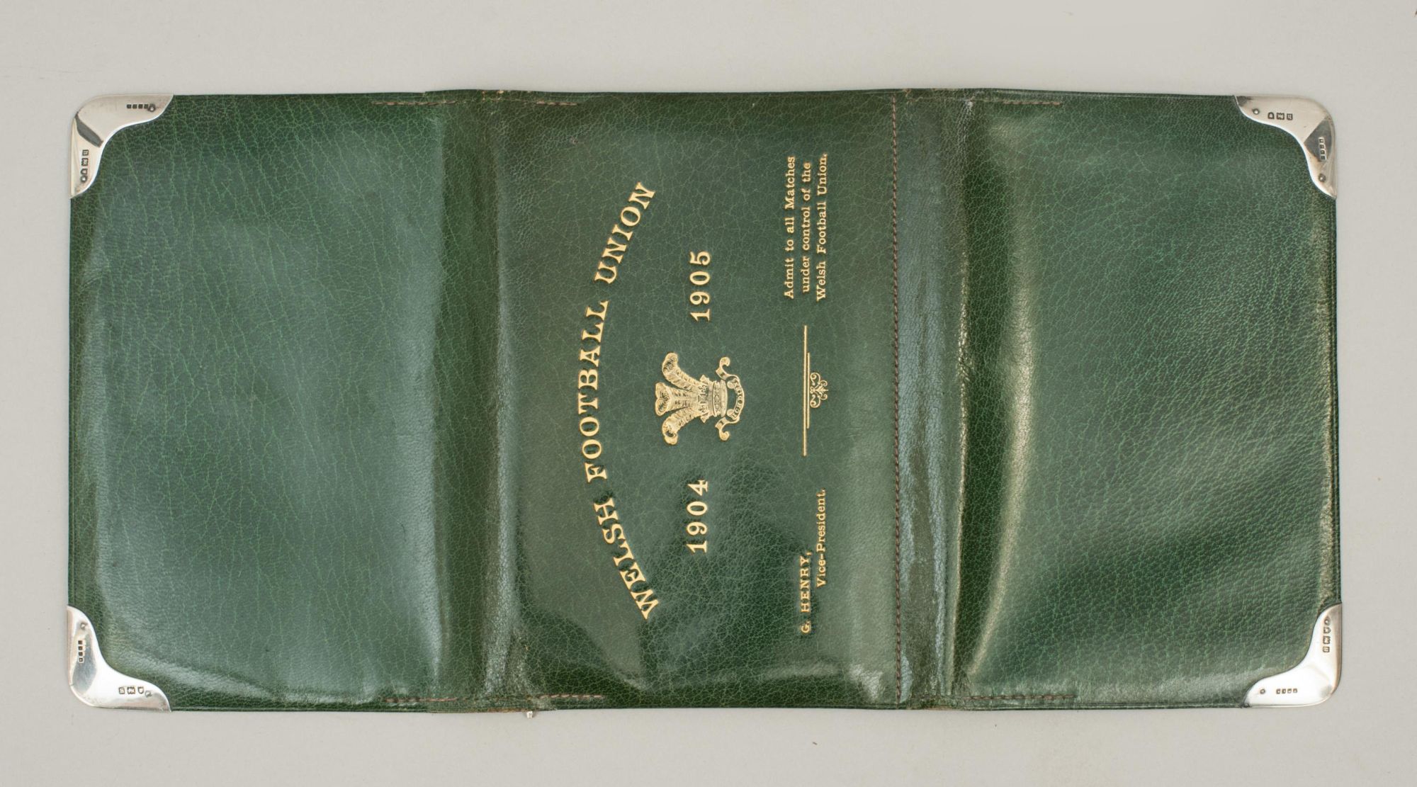 A rare Welsh Football Union season ticket in the form of a green tri-fold leather wallet, formerly belonging to Gavin (G.) Henry, Vice-President of the Welsh Rugby Union and Chairman of Llanelli RFC.