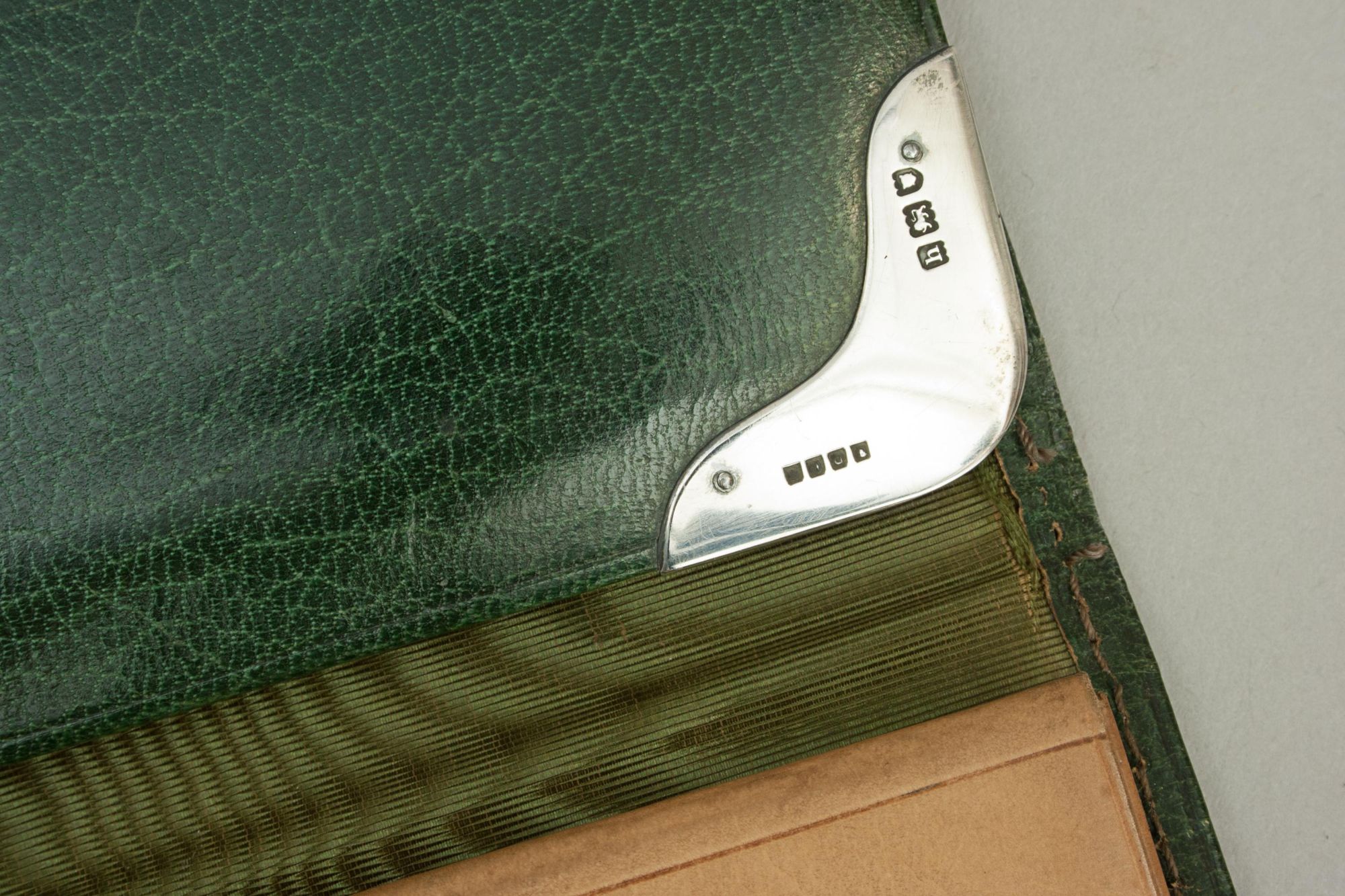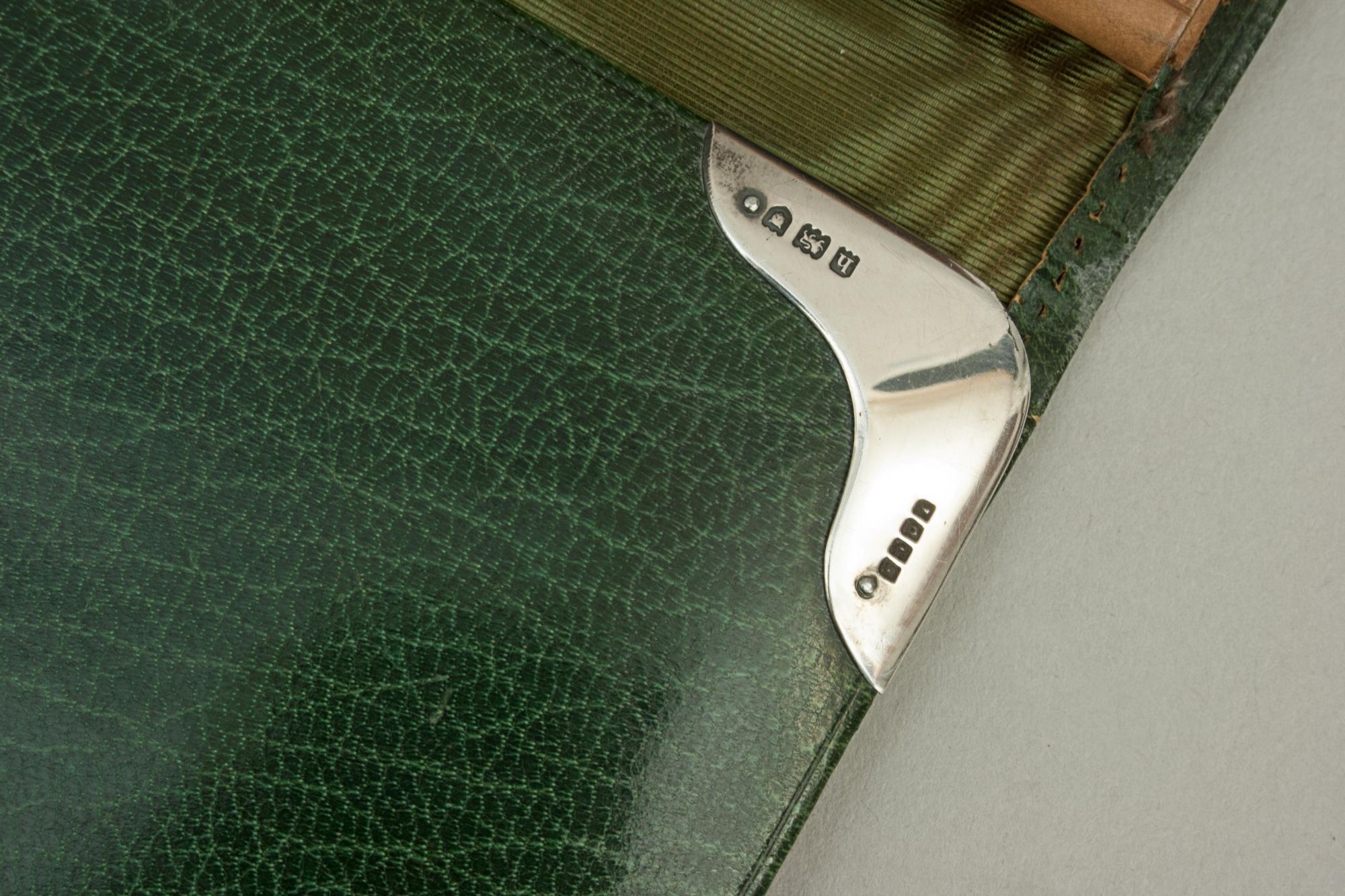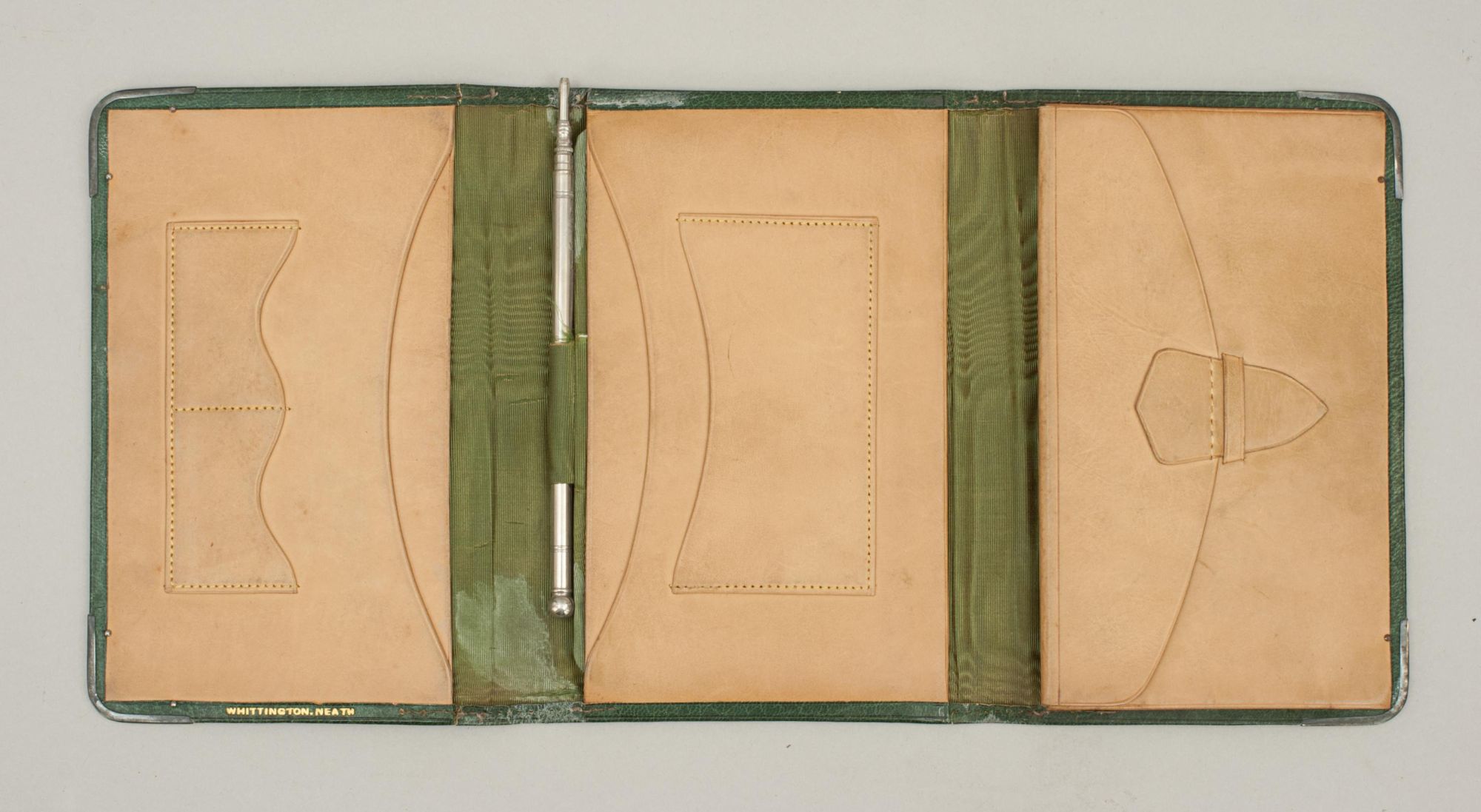 The wallet is in very good condition, with silver corner mounts and light scuffing to the internal folds, consistent with age and use. It is stamped internally "Whittington, Neath", fitted with a propelling pencil, and mounted with silver fittings hallmarked London, 1903.