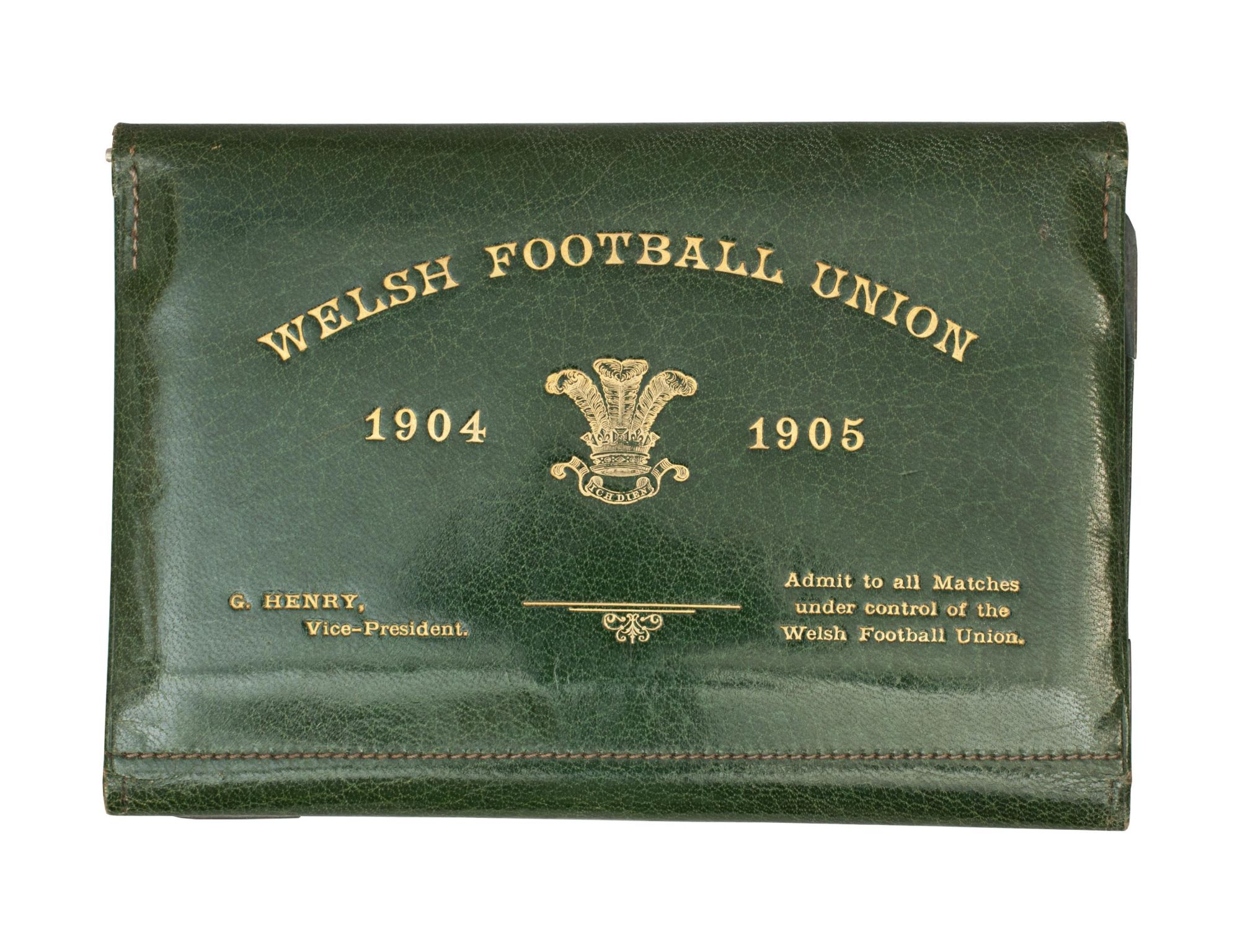 Admit to all matches under control of the Welsh Football Union." The final image shows another wallet and a lapel badge which are available separately on our website. All items originally belonged to G. Henry, Vice-President of the Welsh Rugby Union, and were kept together as part of his personal collection.