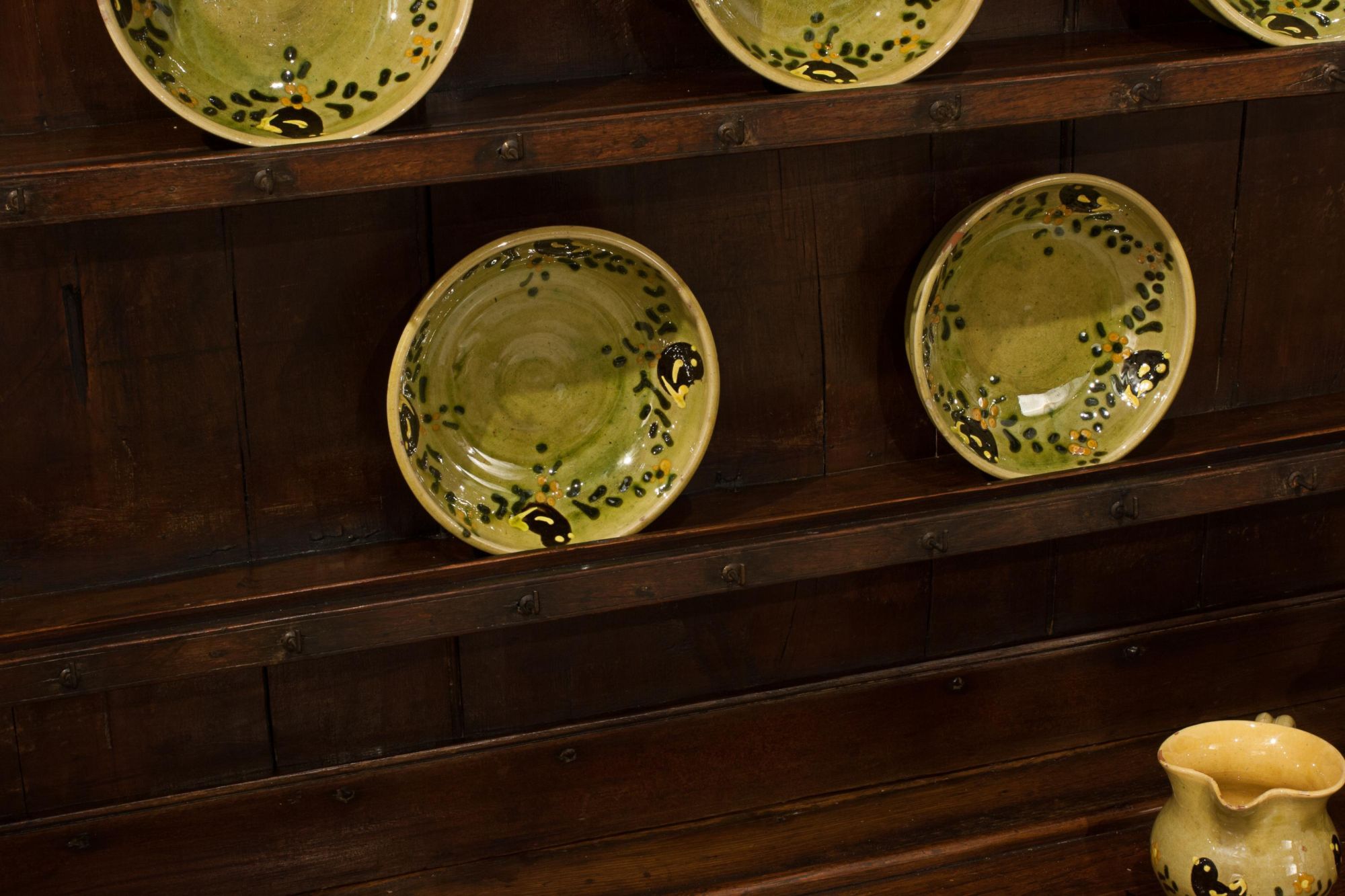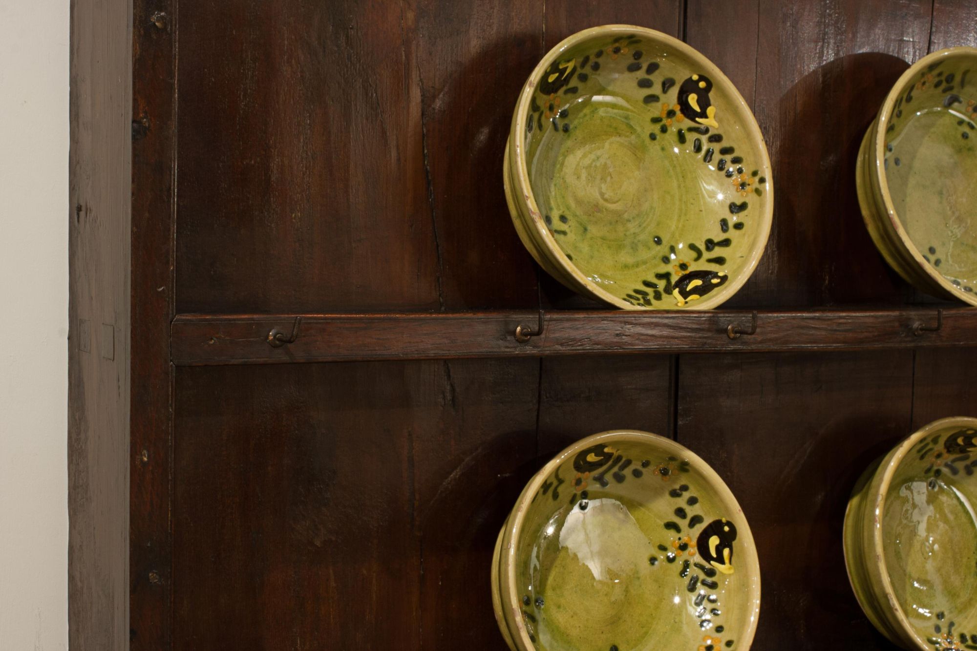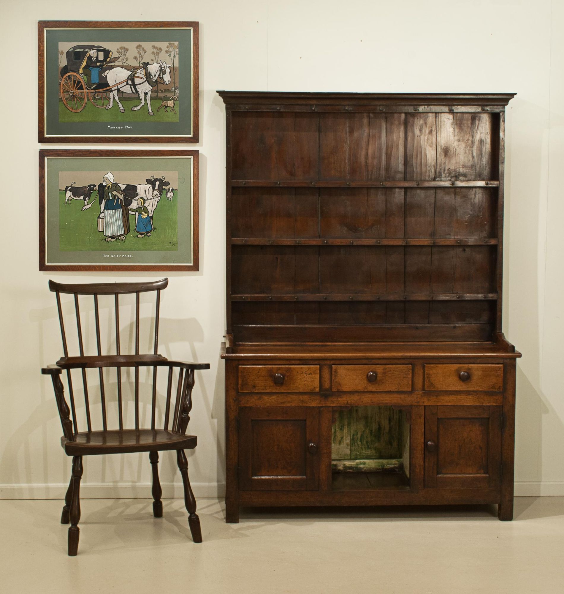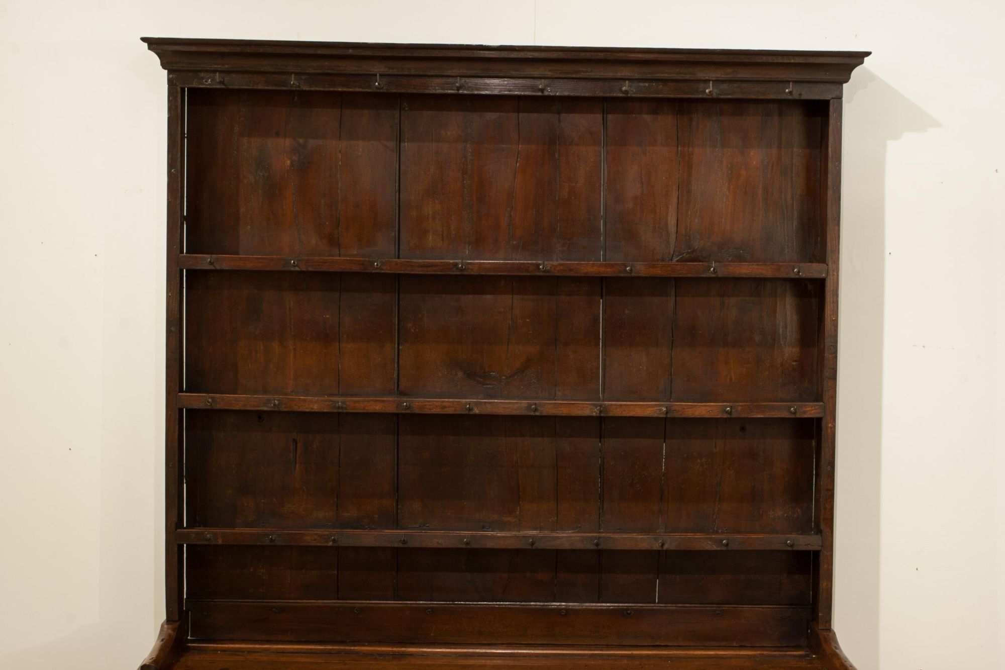 The original plate rack sits above, complete with a moulded cornice, three shelves, and many of its original hooks. It retains its fully planked pine back with wide, original boards, adding to its authenticity and rustic charm.
