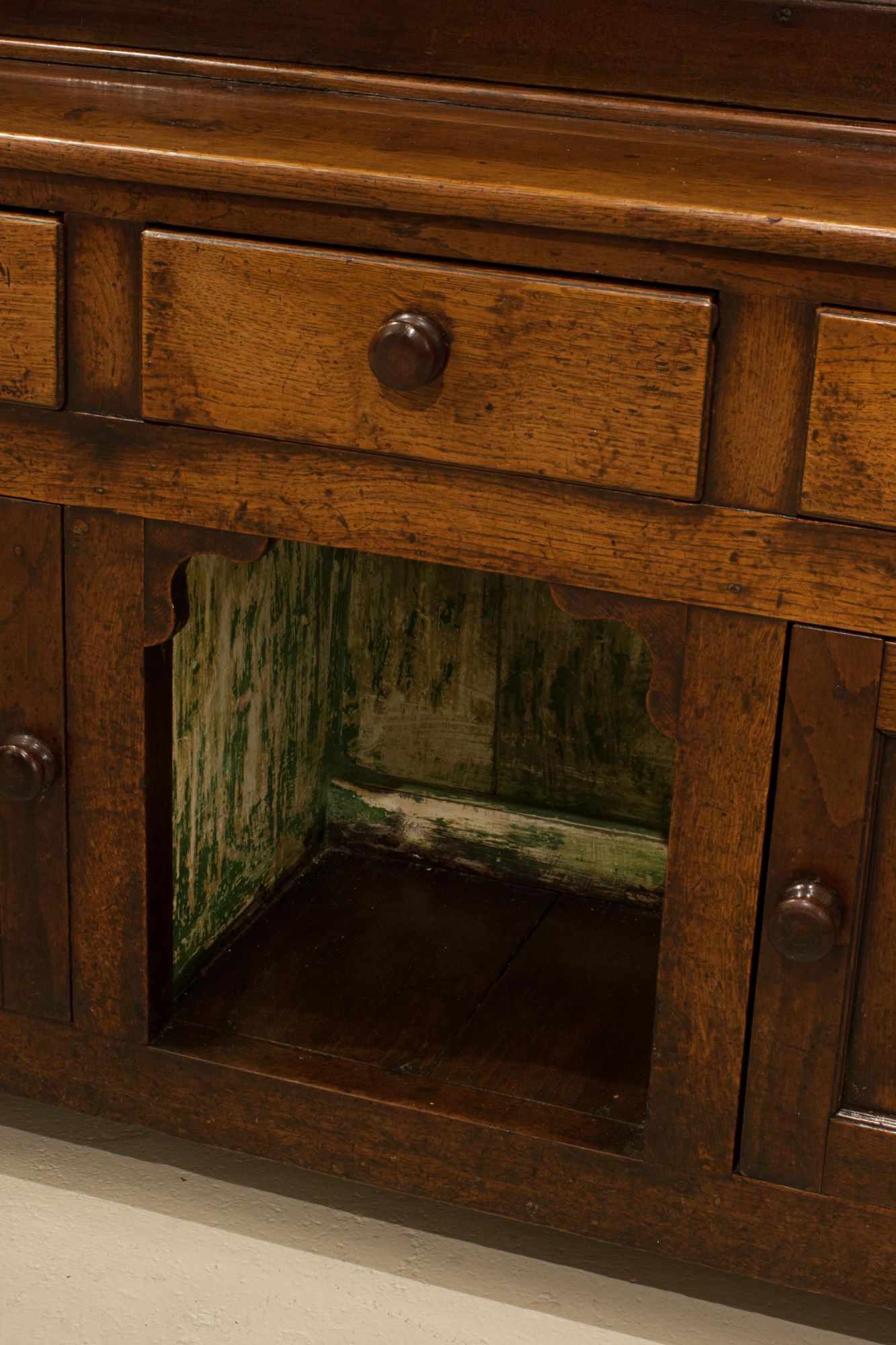 A charming and unusually small late 18th-century country oak dog kennel dresser, combining practicality with classic period character. Crafted from good-quality oak, the dresser features a traditional base with three smoothly opening frieze drawers above a central "dog kennel" recess, flanked by two cupboard doors. Raised on squat feet, the piece offers both functionality and visual appeal in a compact form.