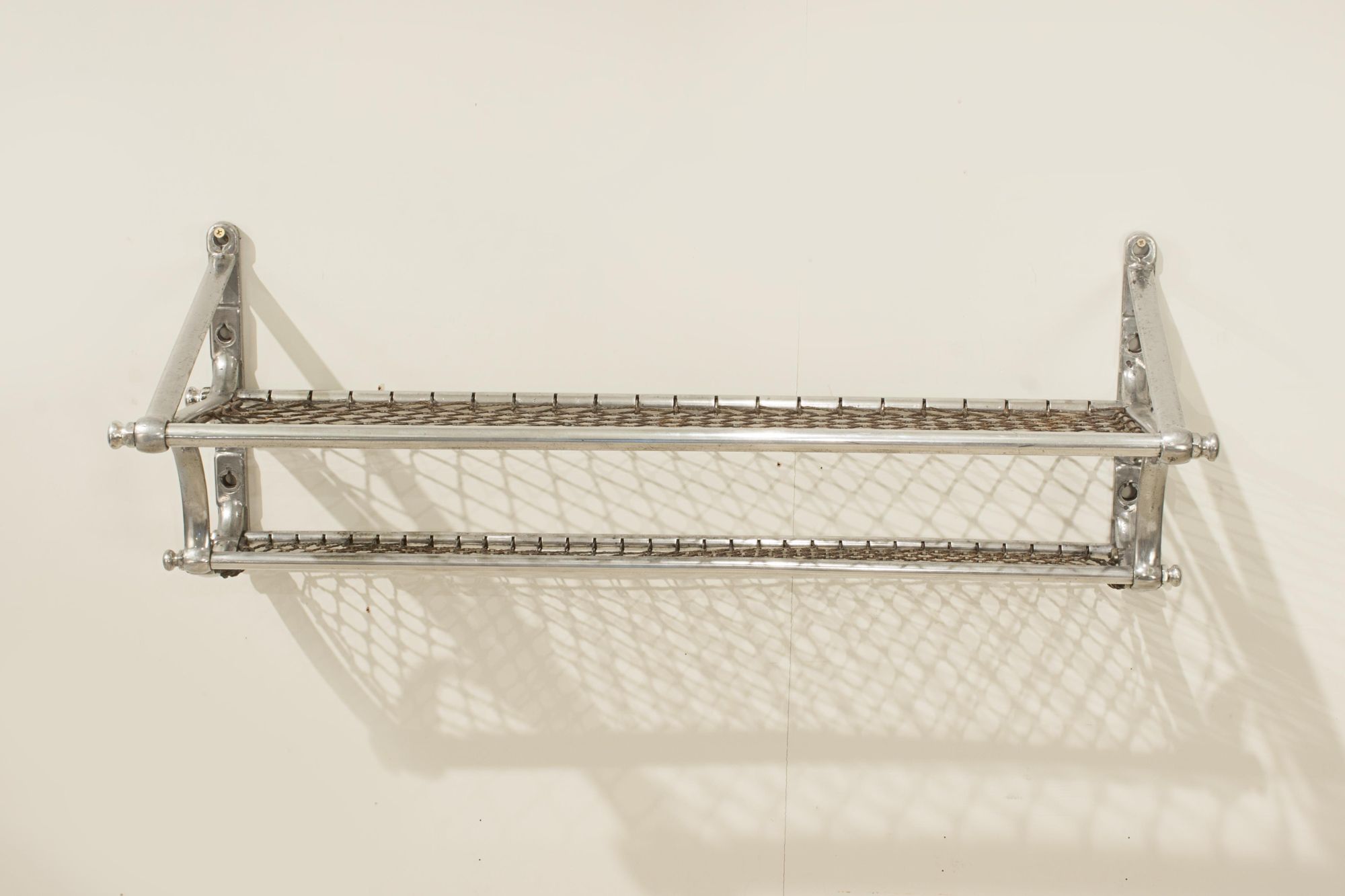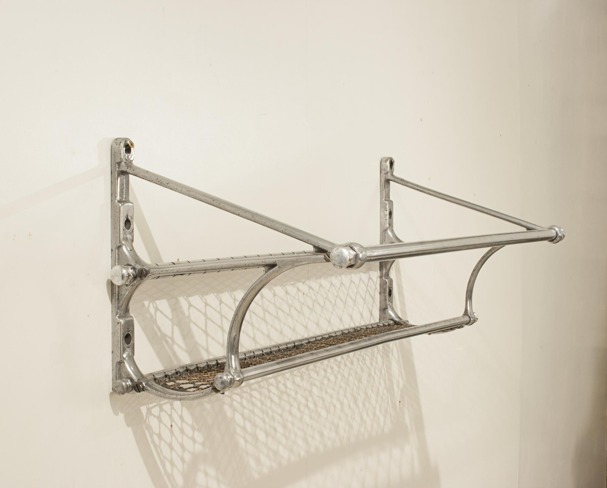 A superb and authentic railway carriage luggage rack dating from around 1930. These wonderful, untouched examples feature cast aluminium end brackets supporting two tiers, each fitted with wire mesh inserts. The upper shelf was originally designed for luggage, while the lower rack was intended for hats and smaller items.