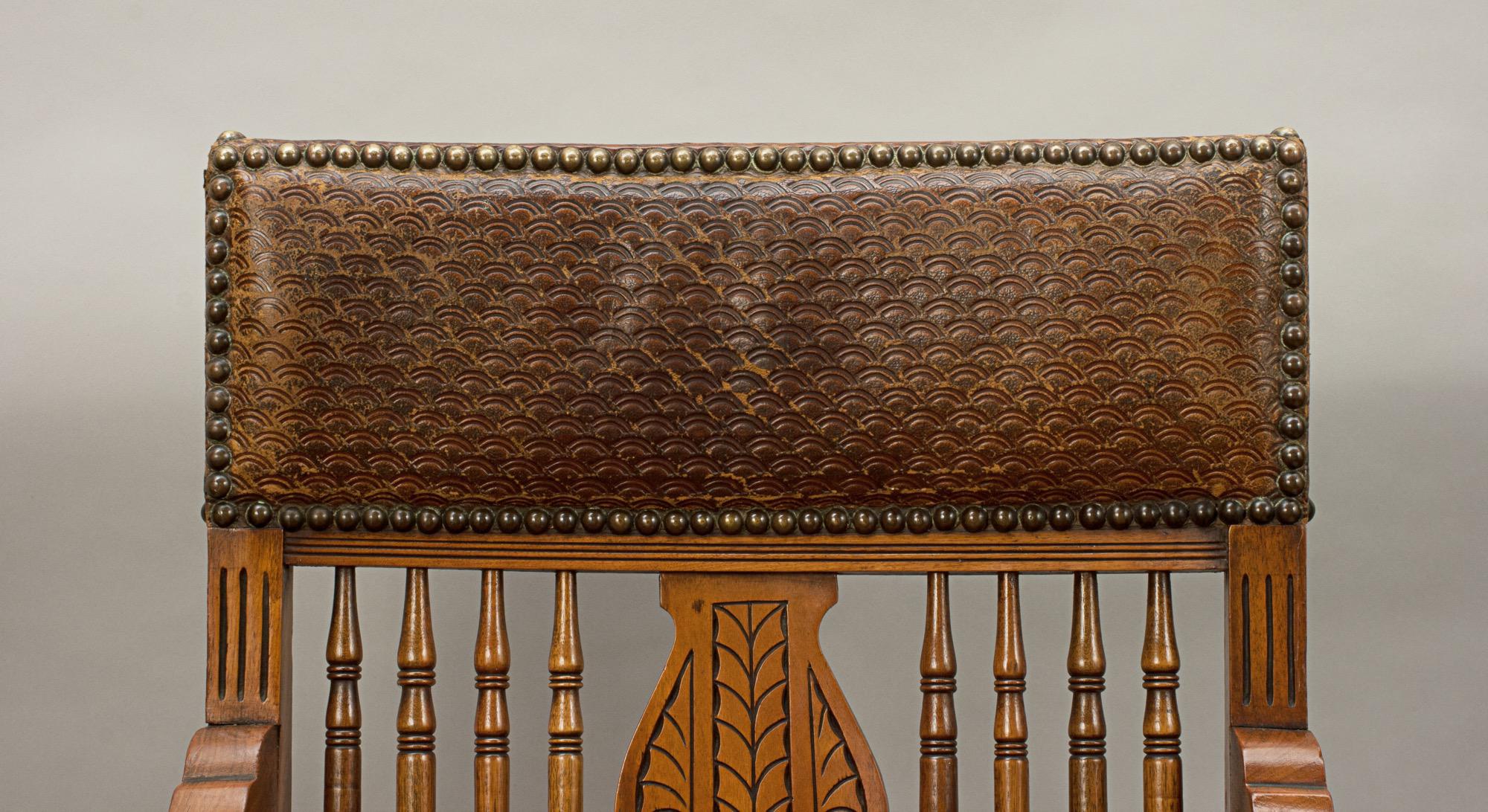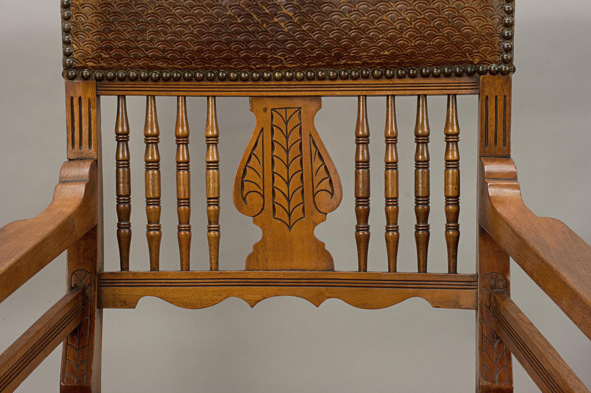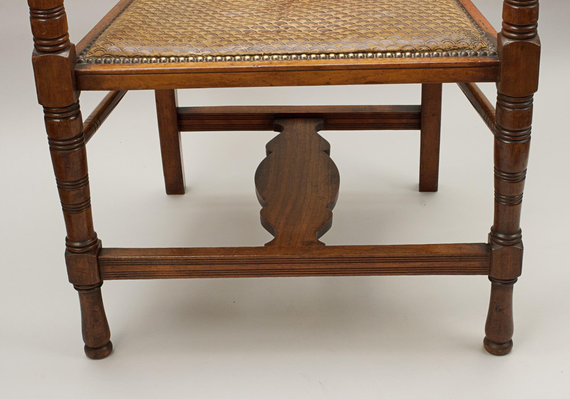 A wonderfully well proportioned walnut desk chair attributed to G.F Armytage in from a design by Lamb of Manchester. The chair with well turned front legs, shaped square back legs supported by stretchers, beautifully embossed leather seat and back with brass studding. Back rest with eight turnings and a carved splat. There are further carvings on the back legs, the desk chair also has well shaped arms.